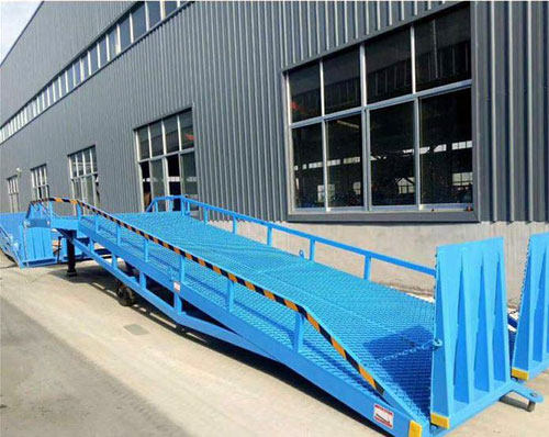 移動式液登車橋是與叉車配合使用的貨物裝卸輔助設備。移動式液登車橋是與叉車配合使用的貨物裝卸輔助設備。采用人工液壓動力,勿須外接動力電源即可輕松實現登車橋的高度調節。可調節長度的索鏈用于鉤住車輛,使登車橋與車輛即使發生移位時,始終緊密貼合。移動輪采用實心輪胎,不用充氣,堅固,配合剎車墊,保證作業安全。
