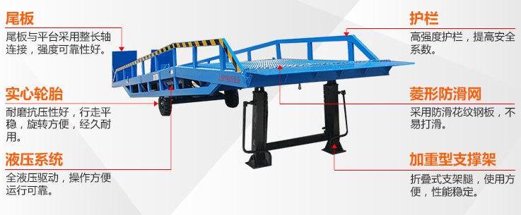 棗莊登車橋-集裝箱裝卸過橋-裝車斜坡登高裝貨叉車液壓登車橋-移動式液壓登車橋應(yīng)用于無裝卸設(shè)備的貨臺及流動裝卸場所,是與叉車配合使用的貨物裝卸輔助設(shè)備。借助該設(shè)備,叉車能直接駛?cè)肫囓噹麅?nèi)部進行批量裝卸作業(yè)。只需單人操作,不需要動力電源,即可實物的安全快速裝卸。即可使您減輕勞動強度,又能成倍提高裝卸作業(yè)效率,加快物料流通速度,獲取更大經(jīng)濟效.臺面使用特制的菱形網(wǎng)絡(luò)板有可靠的強度,能保證長期使用而。它的菱形網(wǎng)狀結(jié)構(gòu),充分保證了防滑性能,使叉車有更好的爬坡性和可操作性。即使在雨、雪罐子。仍能保證正常使用。